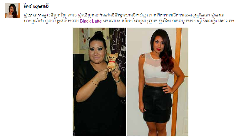រហូតដល់ខ្ញុំបានឈានដល់អាយុ 27 ឆ្នាំ ខ្ញុំសកម្មក្នុងរឿងសម្រករាង ខ្ញុំមានរាងស្រឡូនស្អាត។ ប៉ុន្តែឆ្នាំ និងការប្រែប្រួលអ័រម៉ូនបានជះឥទ្ធិពលមកលើរាងកាយខ្ញុម។ ខ្ញុំមិនសូវមានកម្លាំងកាយ និងកម្លាំងចិត្តដើម្បីលេងកីឡា និងតមអាហារឡើយ។ ខ្ញុំត្រូវផ្លាស់ប្តូរខោអាវរបស់ខ្ញុំ ត្រូវទិញខោអាវទំហំធំជាងមុន។ បន្ទាប់មកទំហំធំជាងមុនទៀត...ទាំងអស់នេះនាំទៅដល់ទំហំធំជាងមុនមួយលេខទៀត នៅពេលដែលមិត្តរបស់ខ្ញុំបាននាំយកភេសជ្ជៈ Black Latte និងប្រាប់ឲ្យខ្ញុំផឹកវាជារៀងរាល់ថ្ងៃ។ នាងបានប្រាប់ខ្ញុំផឹកទឹកឲ្យបានច្រើនជាងមុន។ ខ្ញុំមិនបានជឿលើលទ្ធផលទេ។ សាកគិតពីការភ្ញាក់ផ្អើលរបស់ខ្ញុំ នៅពេលមួយខែក្រោយមក ខ្ញុំអាចស្លៀកខោអាវចាស់ៗរបស់ខ្ញុំចុះវិញ! លើសពីនេះ ខ្ញុំមានអារម្មណ៍ថាមានកម្លាំងជាងមុន ពោរពេញដោយថាមពល! ស្បែករបស់ខ្ញុំក៏មើលទៅក្មេងជាងមុន។ ខ្ញុំមិនដឹងថាវាមកពី Black Latte ឬជារឿងចៃដន្យនោះទេ ប៉ុន្តែជញ្ជីងមិនចេះកុហកទេ! លើសពីនេះ ខ្ញុំគិតថាខ្ញុំក្មេងជាងមុន 10 ឆ្នាំ!